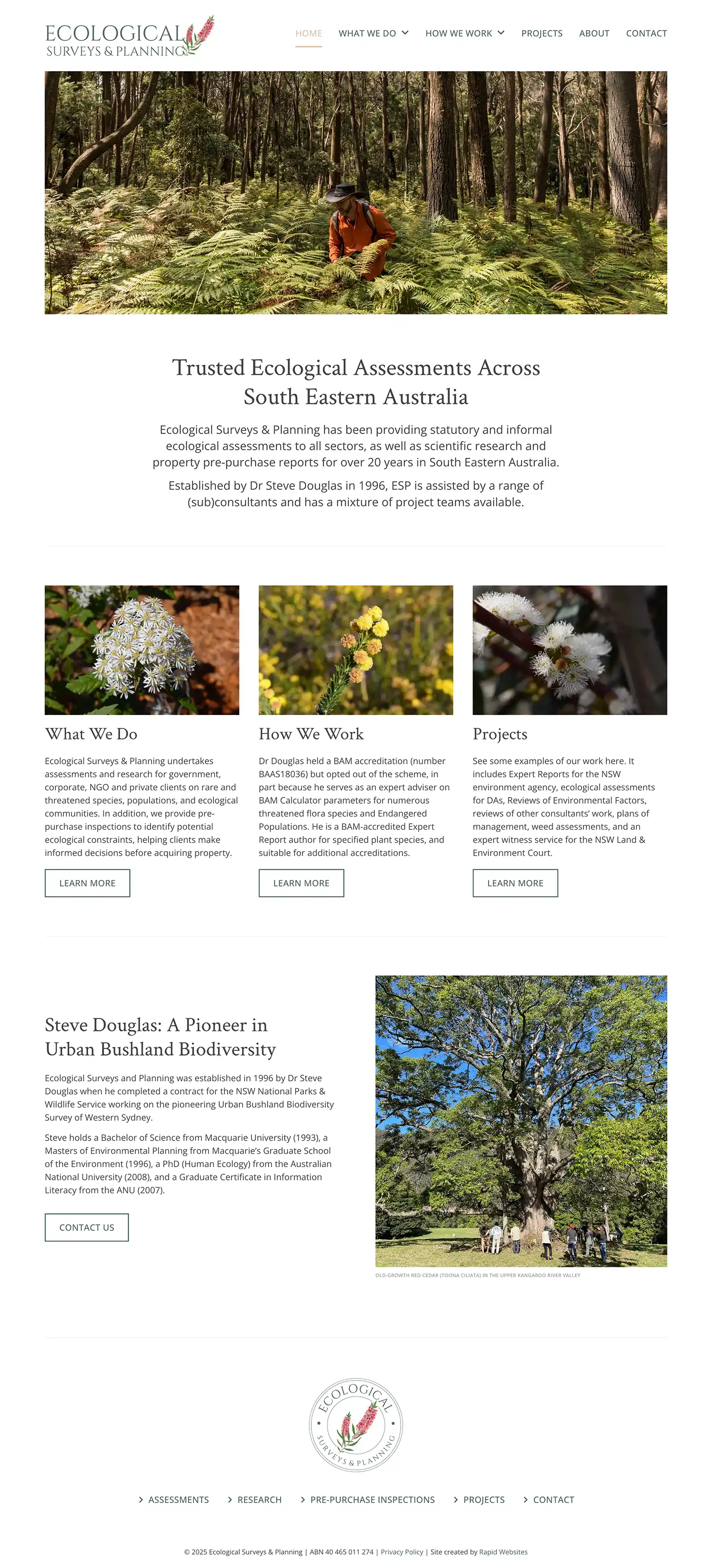 We developed a clean, professional WordPress website that showcases the depth of expertise and experience behind Ecological Surveys & Planning. Built with Elementor, the new site features a well-organised service structure, clear navigation, and an understated design aesthetic that aligns with the scientific nature of their work. The inclusion of a regularly updated blog highlights ongoing projects and fieldwork, while pages outlining ethics, methodology, and accreditations strengthen transparency and trust. The project also underscores the advantages of working with a local Australian web designer for responsive support and tailored solutions.